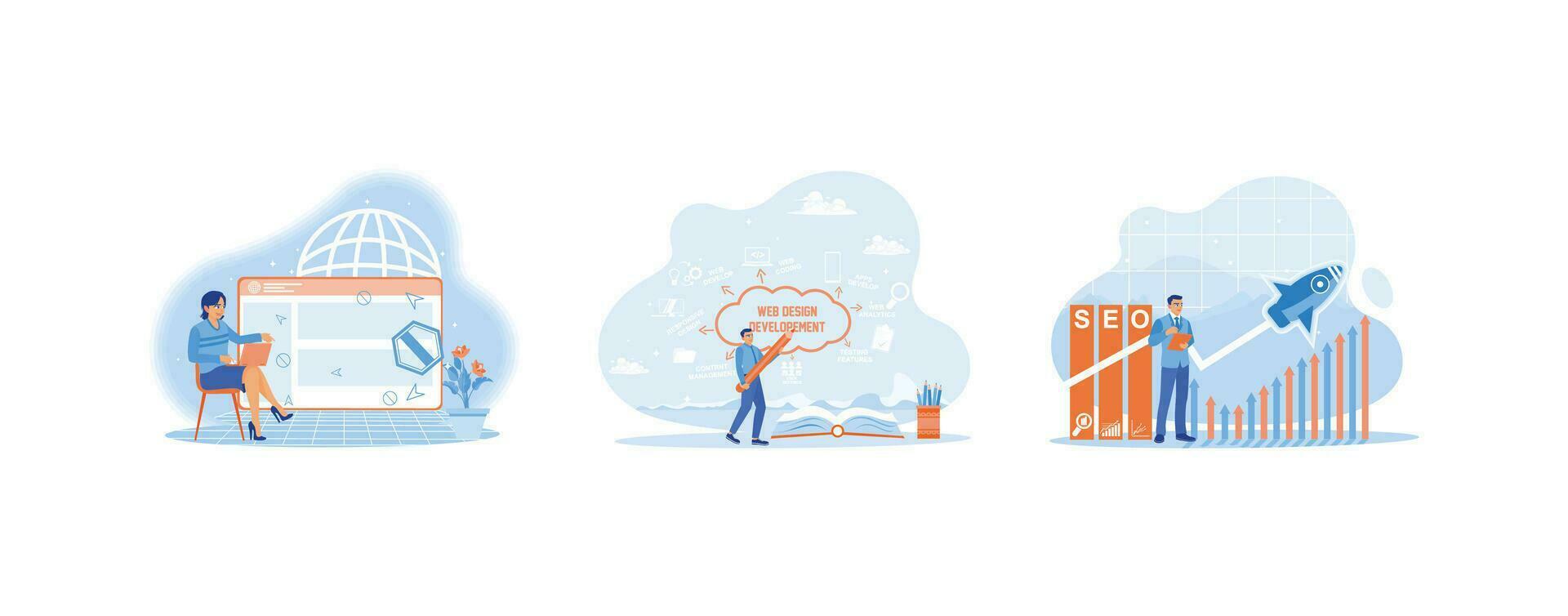 Women using web window search info on the laptop screen and creating web design and development charts on the whiteboard. Entrepreneurs use SEO to promote ranking traffic on websites. Pro Vector