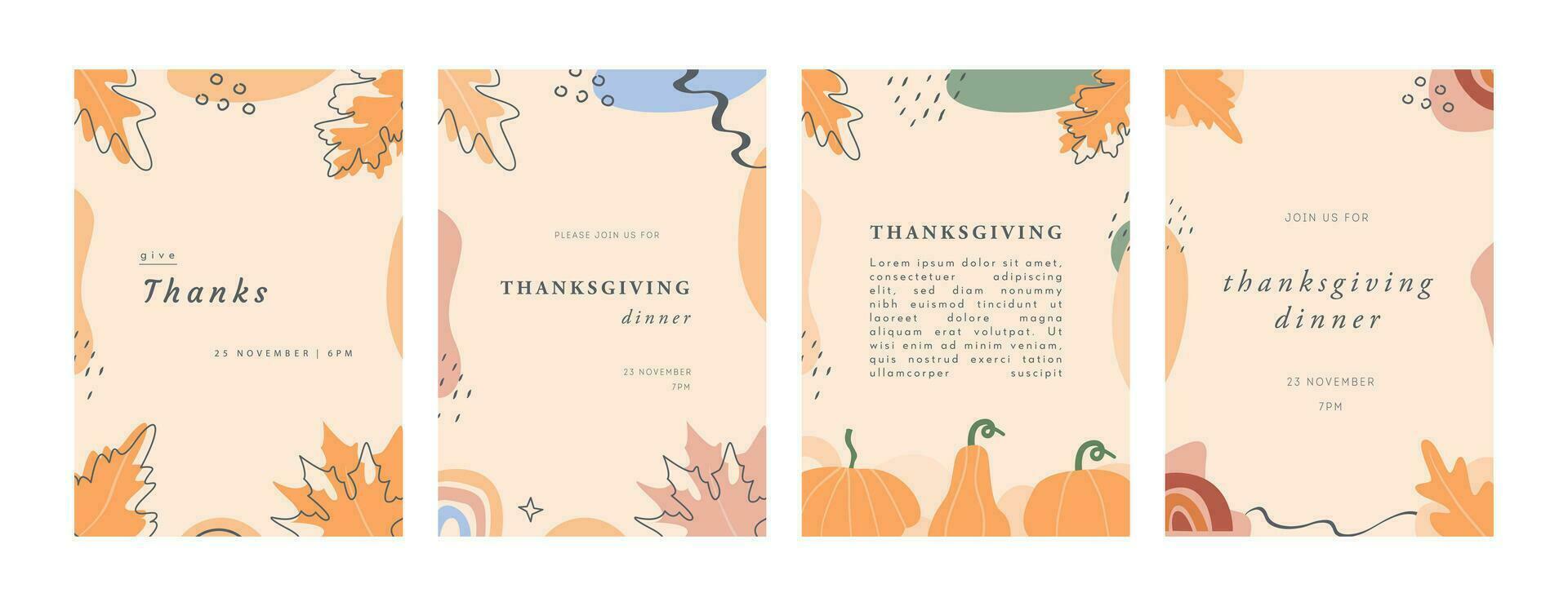 Abstract horizontal Happy Thanksgiving banner template. Trendy minimal background with autumnal leaves, pumpkin and geometric shapes. Vector border with copy space for text in flat style. Pro Vector