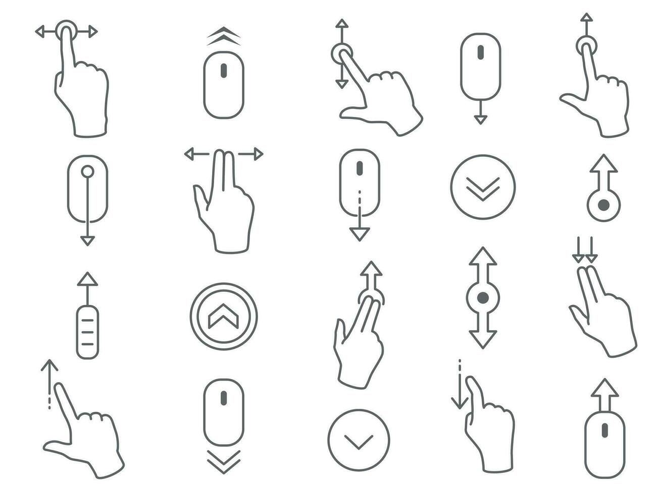 Line scroll gestures. Scrolling mouse, touchscreen gesture and scroll elements. Back to top, scrolled down and page navigation vector icon. Pro Vector