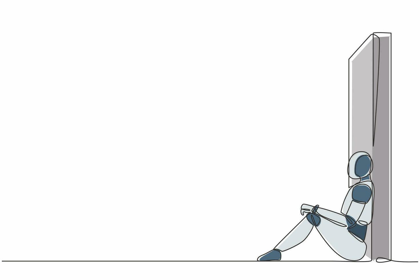 Single continuous line drawing robot sitting on floor and lean against wall. Failure, sad, lonely. Robotic artificial intelligence. Electronic technology. One line graphic design vector illustration Pro Vector
