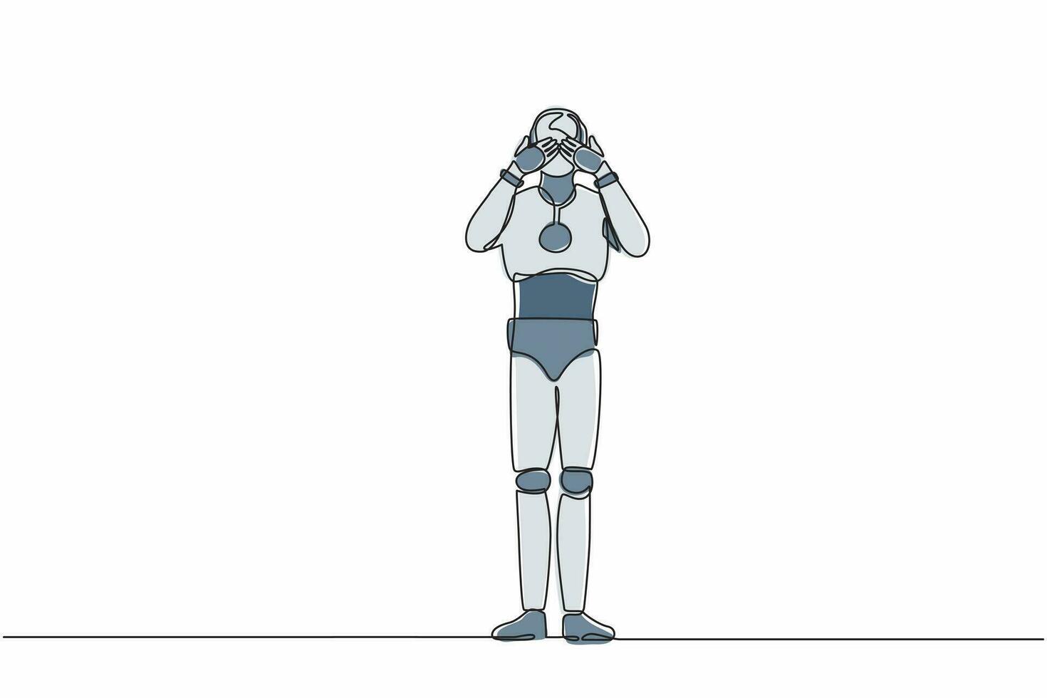 Single continuous line drawing robot closes his eyes with hands because of disgust and reluctance to see something. Robotic artificial intelligence. One line draw graphic design vector illustration Pro Vector