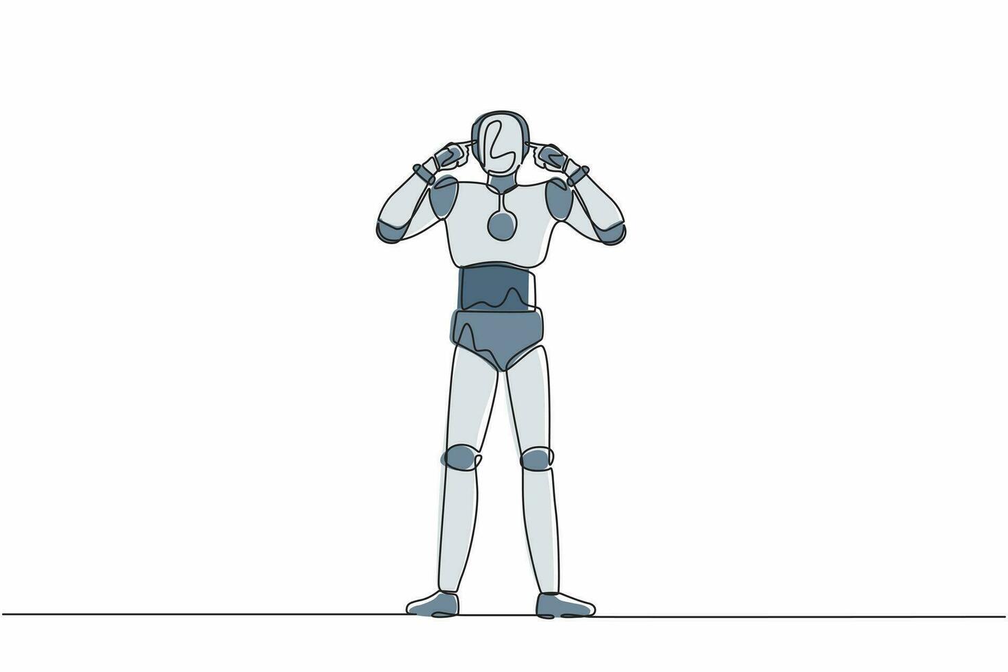 Single one line drawing robot covering ears with fingers with annoyed expression for noise of loud sound or music. Future technology development. Continuous line design graphic vector illustration Pro Vector