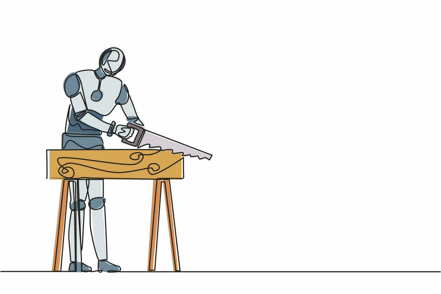 Single one line drawing robot repairman, builder or carpenter sawing boards. Future technology development. Artificial intelligence machine learning. Continuous line draw design vector illustration Pro Vector