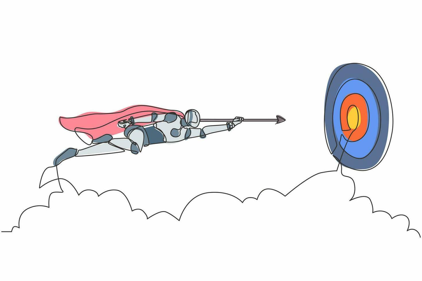 Continuous one line drawing robot superhero flying with arrow forward to goal to achieve success. Humanoid robot cybernetic organism. Future robotic development concept. Single line draw design vector Pro Vector