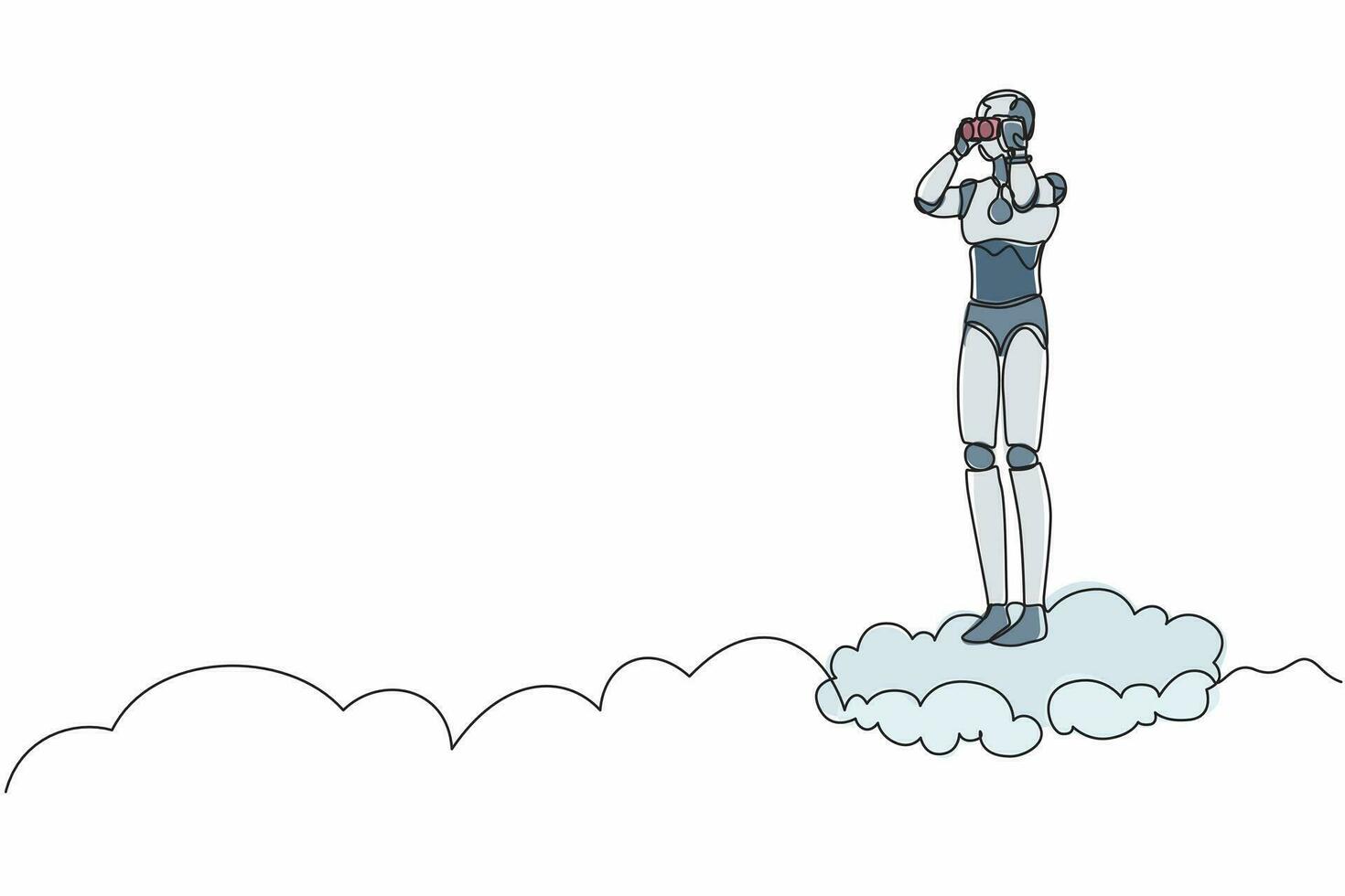Single one line drawing robot on cloud holding binocular to search for business visionary. Future technology development. Artificial intelligence. Continuous line design graphic vector illustration Pro Vector