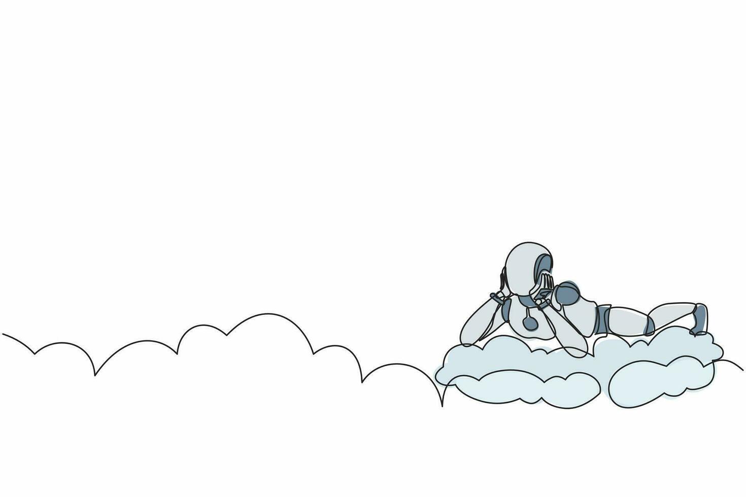 Single continuous line drawing robot lay on the clouds and dreaming or thinking something. Robotic artificial intelligence. Electronic technology industry. One line draw design vector illustration Pro Vector
