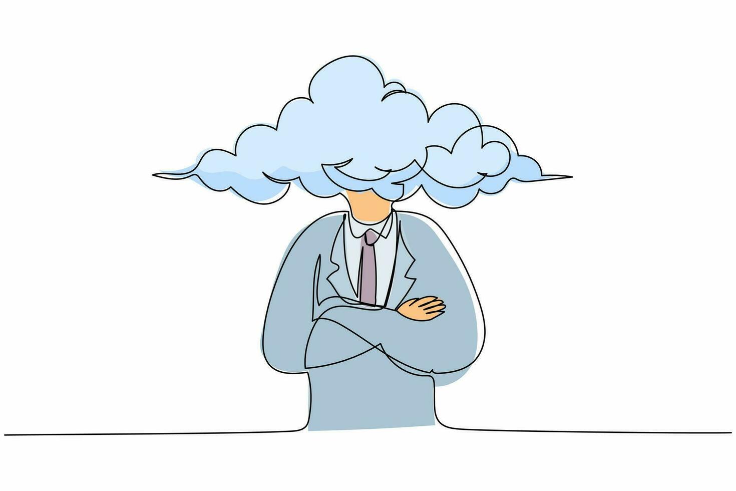 Single continuous line drawing cloud head businessman. Man with empty head and cloud instead. Distracted, daydreaming, absent and impractical concept. One line draw graphic design vector illustration Pro Vector