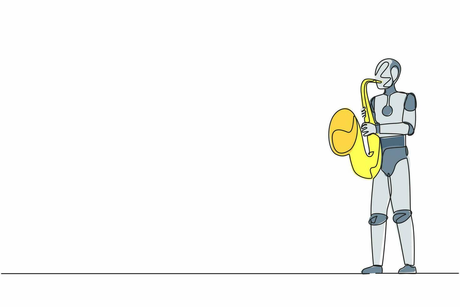 Single one line drawing robot saxophonist perform in festival jazz music. Future technology development. Artificial intelligence and machine learning. Continuous line draw design vector illustration Pro Vector
