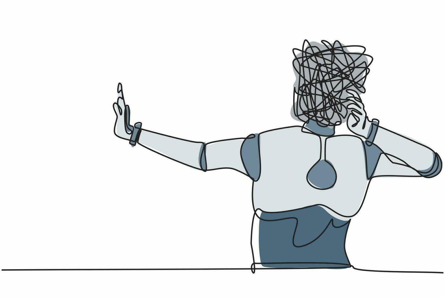 Single continuous line drawing robot with round scribbles instead of head, stop gesture. Robot covering eyes with hand, fear, expression. Artificial intelligence. One line design vector illustration Pro Vector