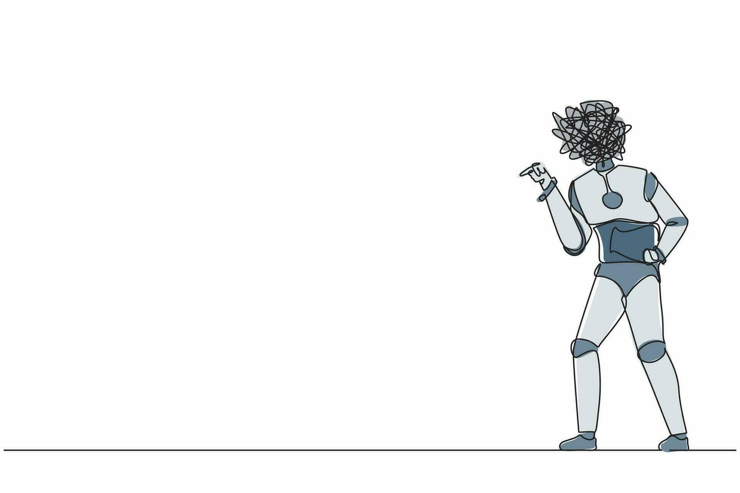 Single one line drawing robot with round scribbles instead of head, conflicting, fight aggressive. Blaming, criticizing. Humanoid robot cybernetic organism. Continuous line design vector illustration Pro Vector
