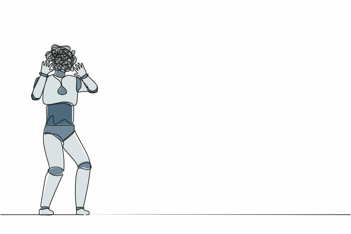 Single continuous line drawing robot with round scribbles instead of head. Robot shocked gesture with palm hands, shouting. Technology artificial intelligence. One line draw design vector illustration Pro Vector