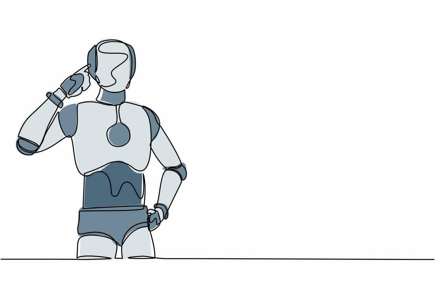 Single one line drawing robot standing with pointing his head, thinking something. Feeling optimistic, visionary. Future technology development. Continuous line draw design graphic vector illustration Pro Vector