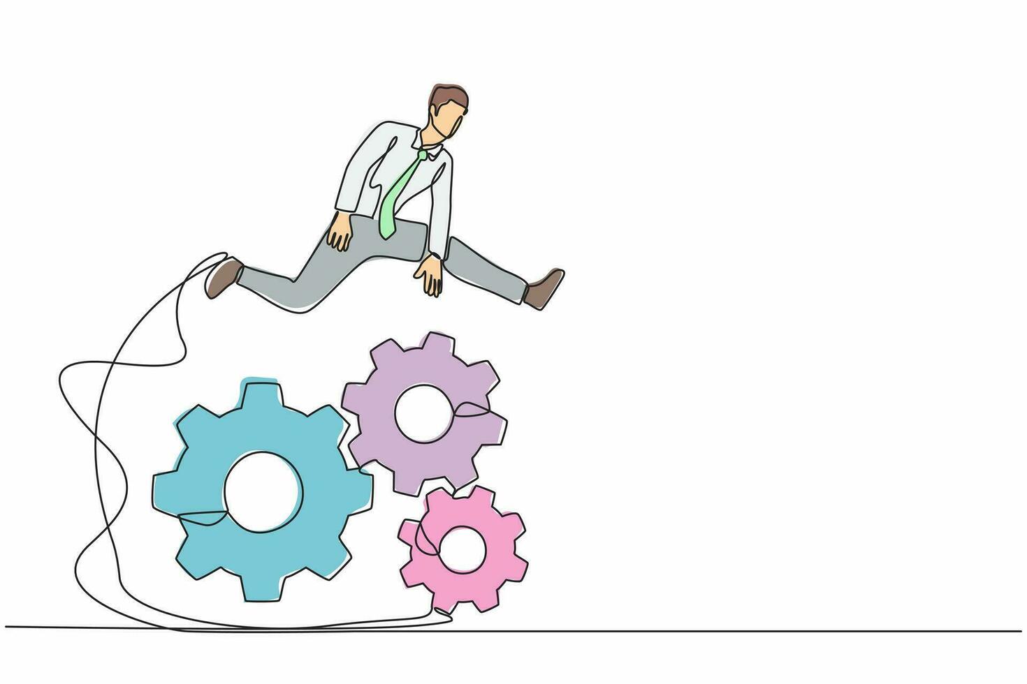 Continuous one line drawing businessman jumping over big gears. Entrepreneur creating and developing business idea twists gear. Operation management system. Single line draw design vector illustration Pro Vector