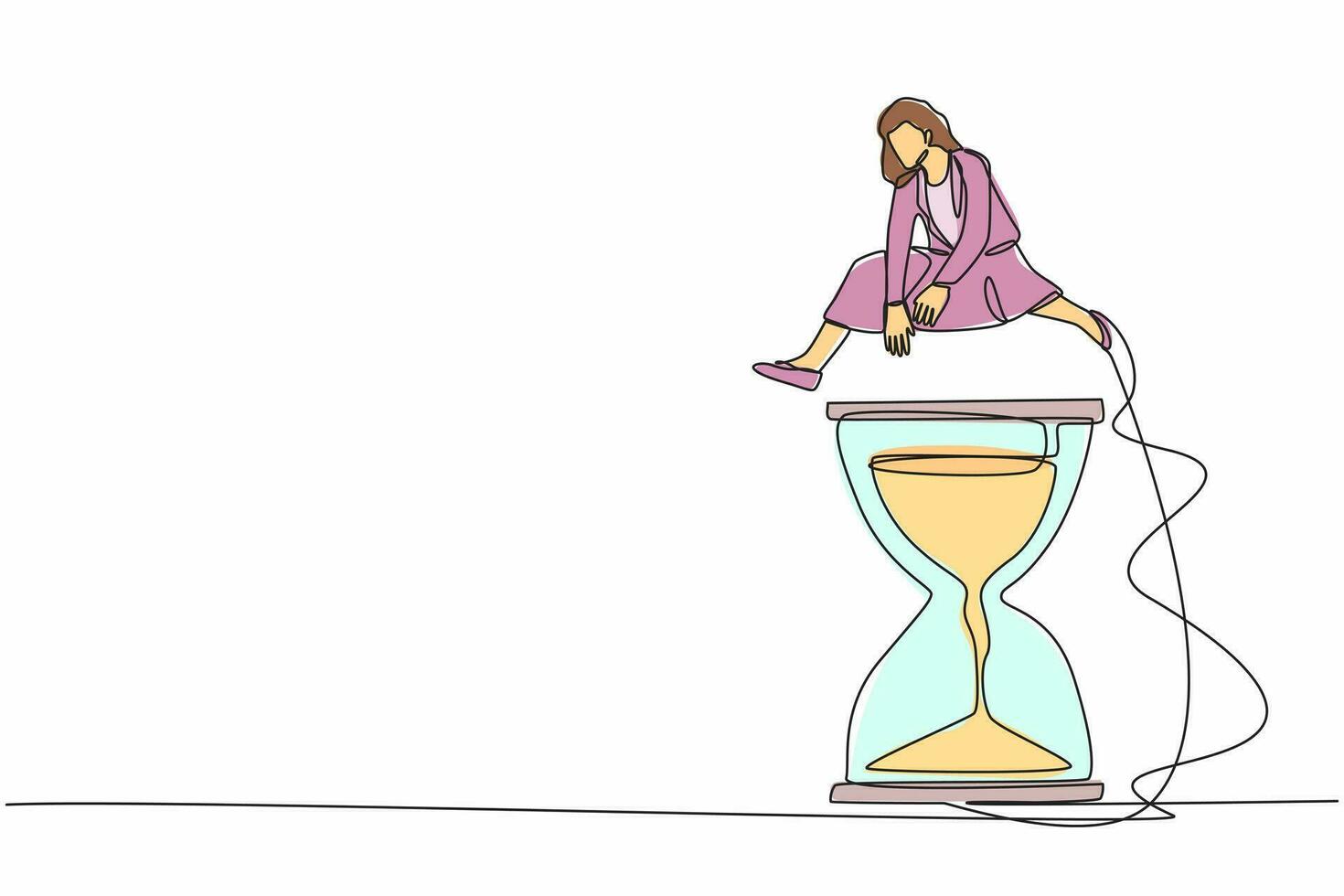 Continuous one line drawing businesswoman jump over or passing hourglass. Business scheduling and time management concept. Deadline or working time efficiency. Single line design vector illustration Pro Vector