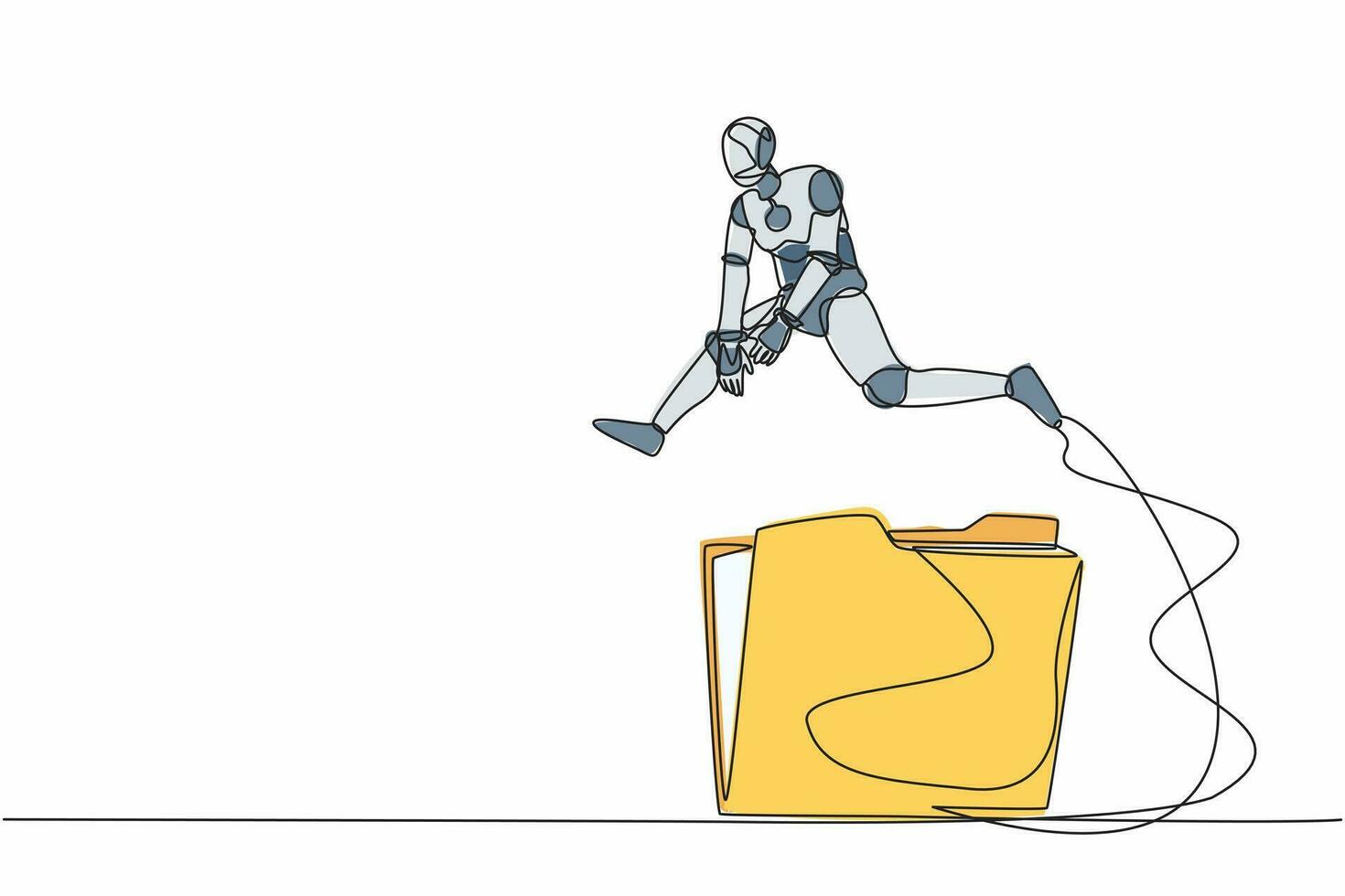 Single one line drawing robot jumping over big folder icon. User data archive. Office paper document, file folders. Future technology development. Continuous line design graphic vector illustration Pro Vector