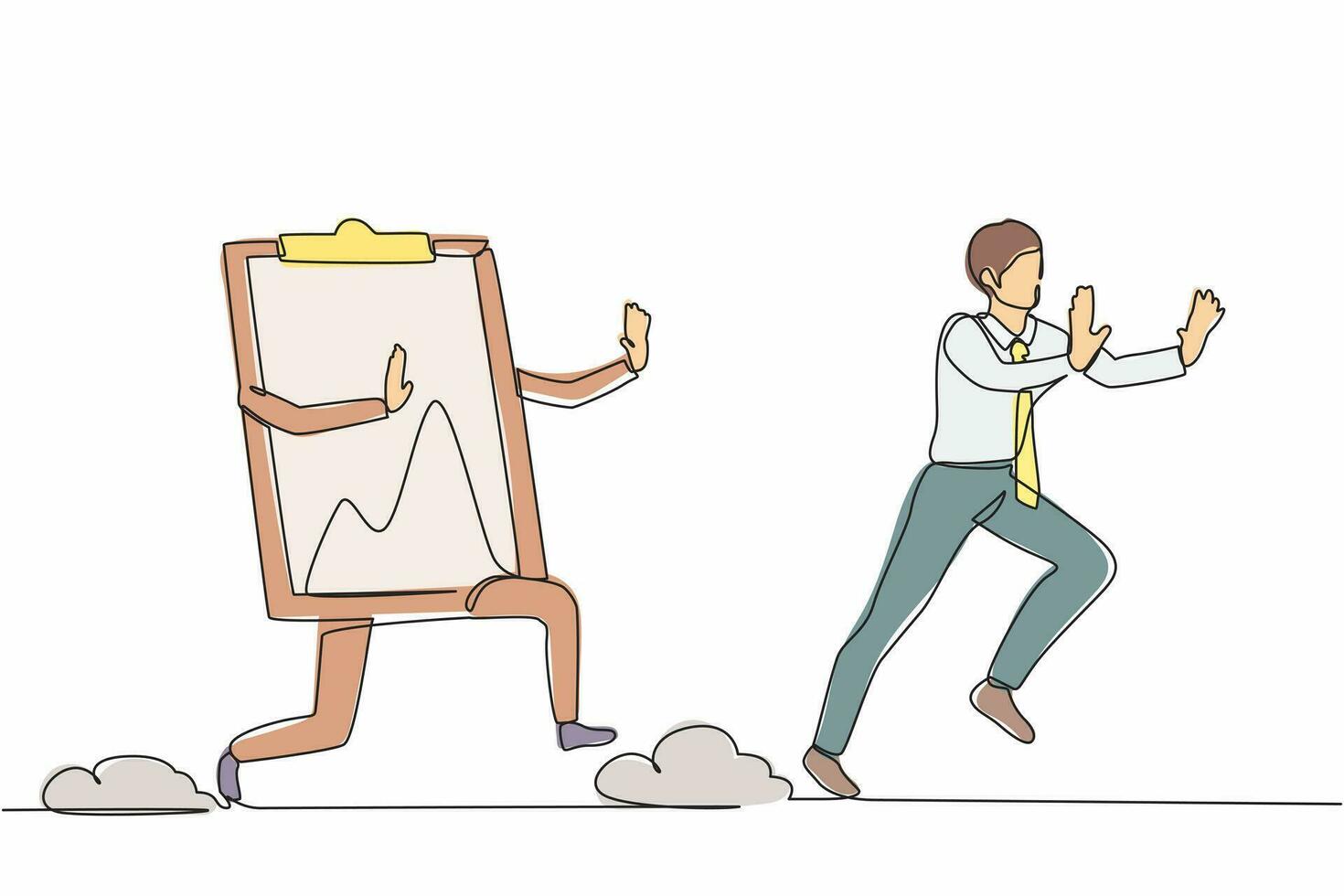 Continuous one line drawing stressed businessman being chased by clipboard. Male employee in deadline checklist application paper sheets document. Single line draw design vector graphic illustration Pro Vector