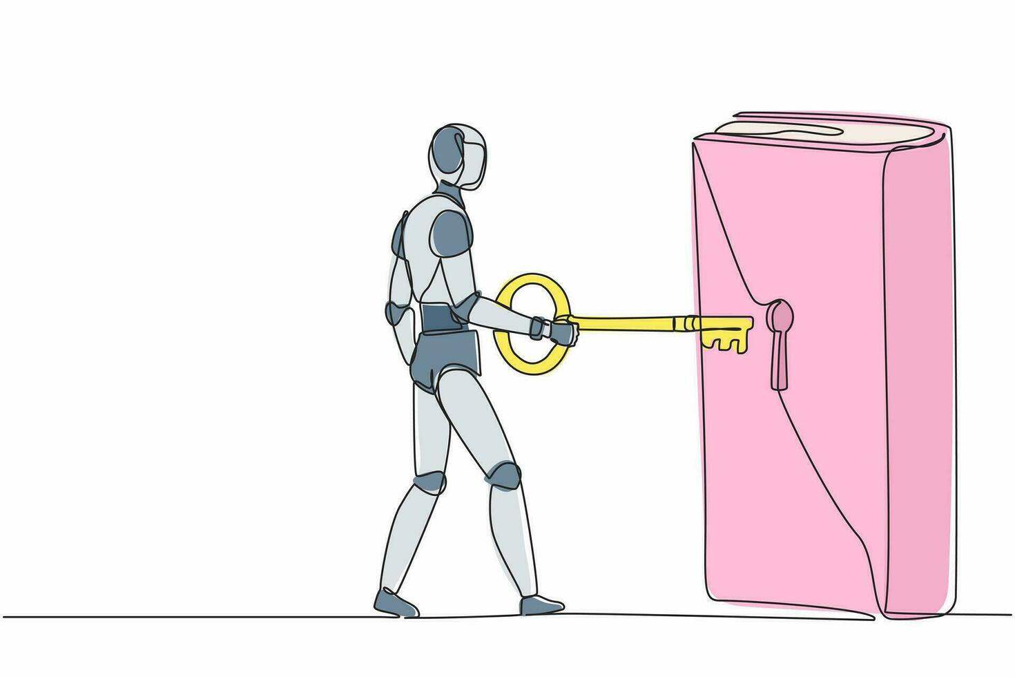 Single one line drawing robot putting big key into book. Unlock textbook, knowledge. Library. Key to new information. Future technology development. Continuous line design graphic vector illustration Pro Vector