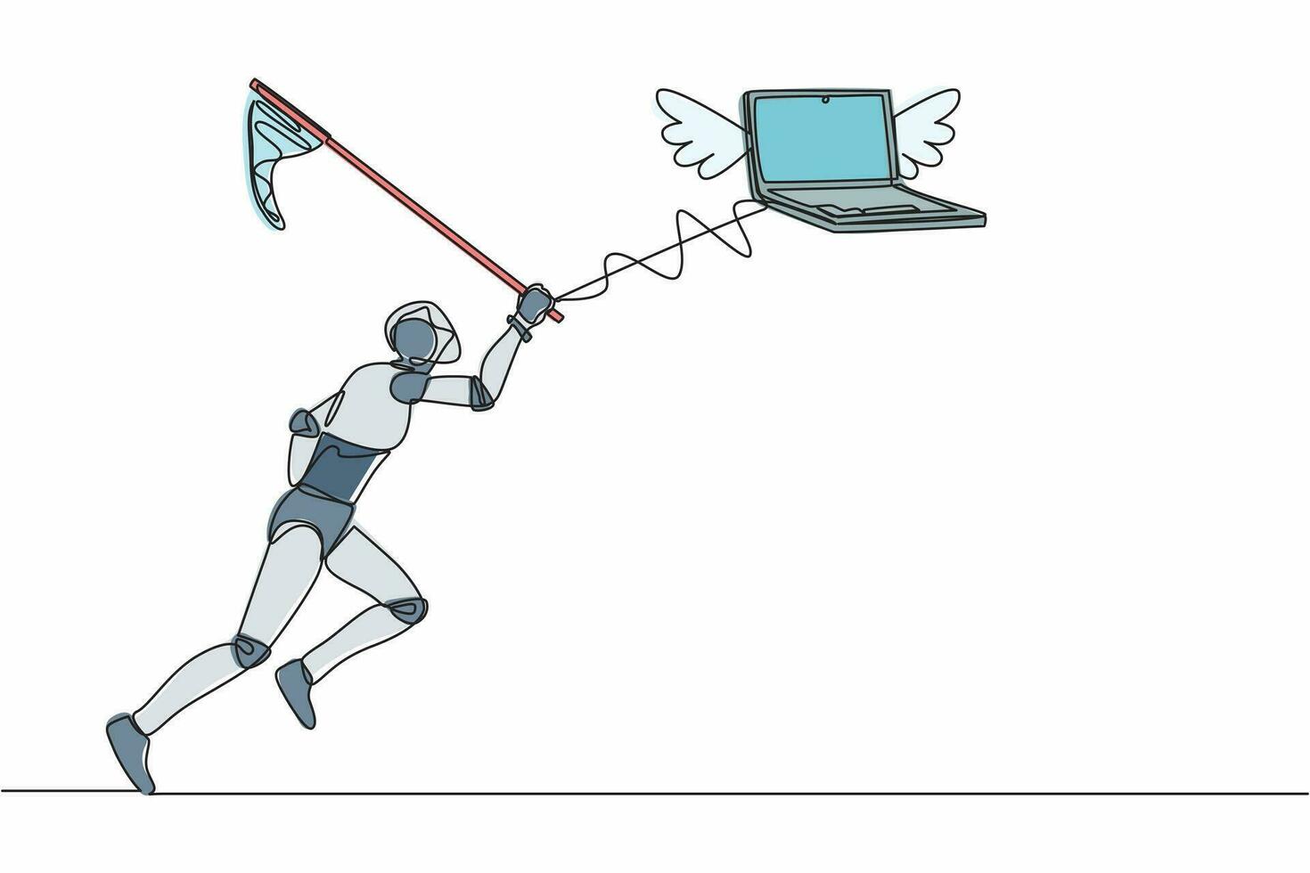 Continuous one line drawing robot try to catching flying laptop with butterfly net. System data computing for working efficiency. Robot cybernetic organism. Single line draw design vector illustration Pro Vector