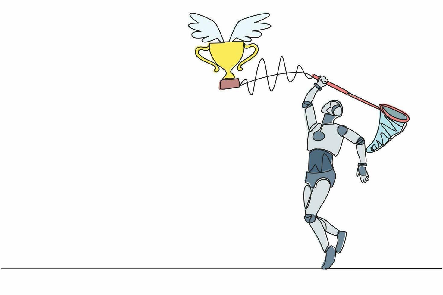Continuous one line drawing robot try to catching flying trophy with butterfly net. Sport tech game. Victory trophies, awards. Humanoid cybernetic organism. Single line draw design vector illustration Pro Vector