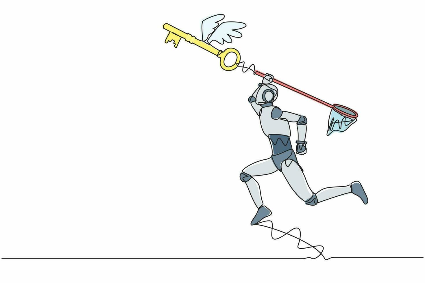 Single continuous line drawing robot try to catching flying key with butterfly net. Find key to solve technology problems. Robotic artificial intelligence. One line graphic design vector illustration Pro Vector