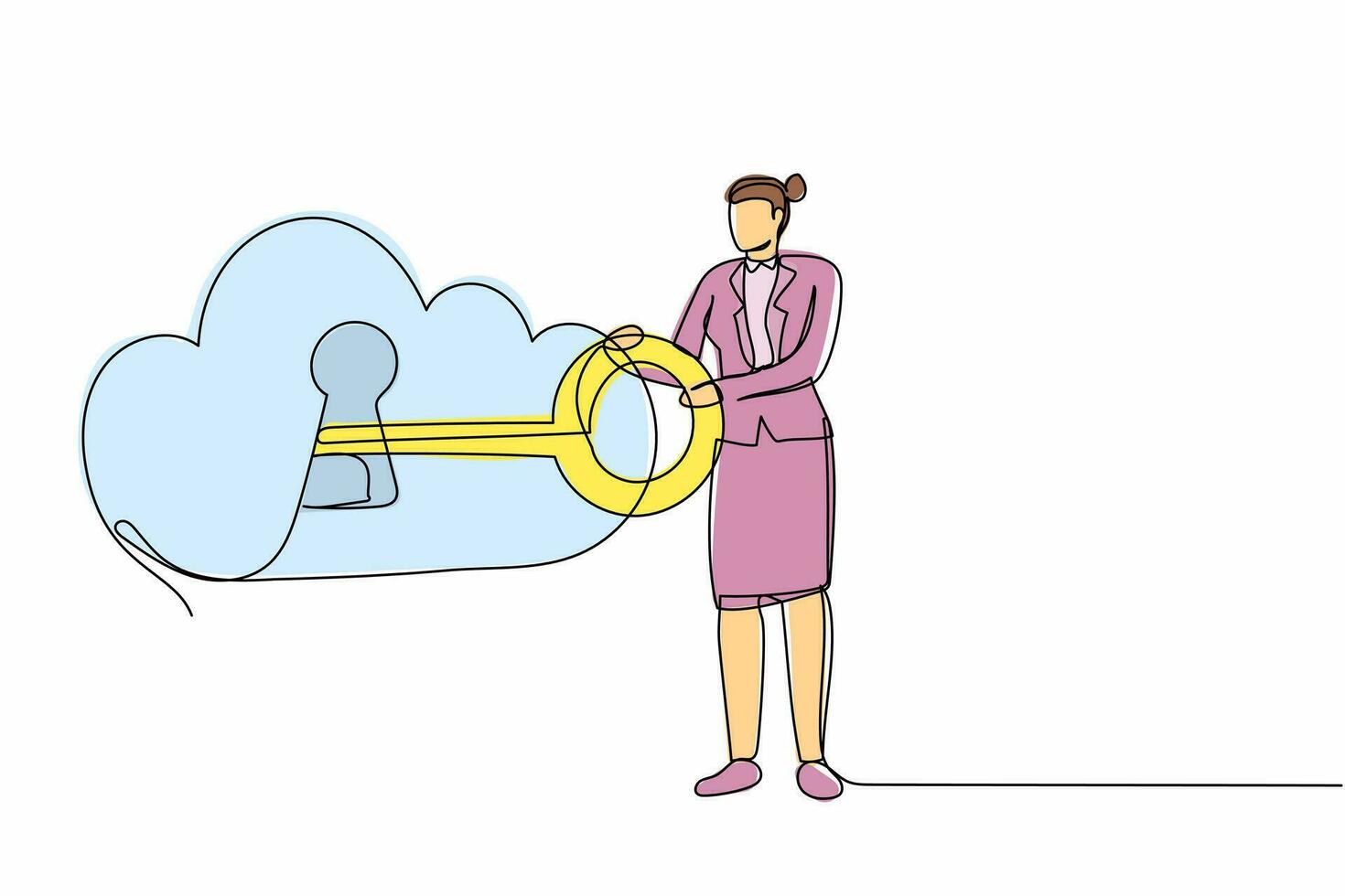 Continuous one line drawing businesswoman put key into cloud. Digital cloud system storage. Password lock security authentication. Online internet technology. Single line design vector illustration Pro Vector