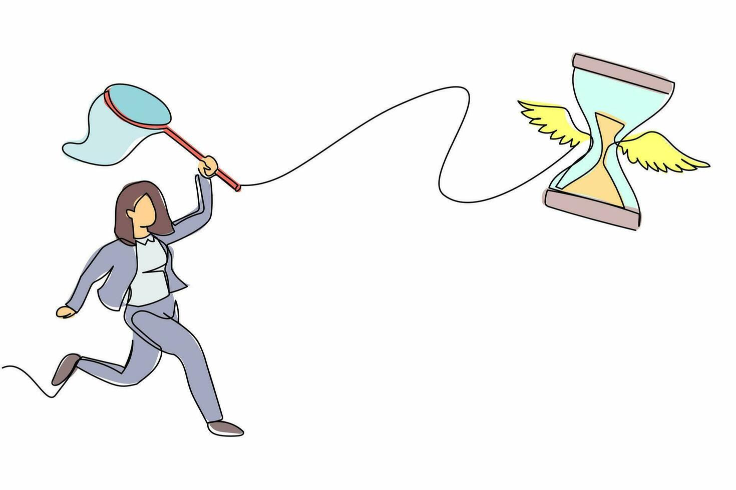 Single one line drawing businesswoman try to catching flying hourglass with butterfly net. Work completion deadline concept. Measure project speed. Continuous line design graphic vector illustration Pro Vector