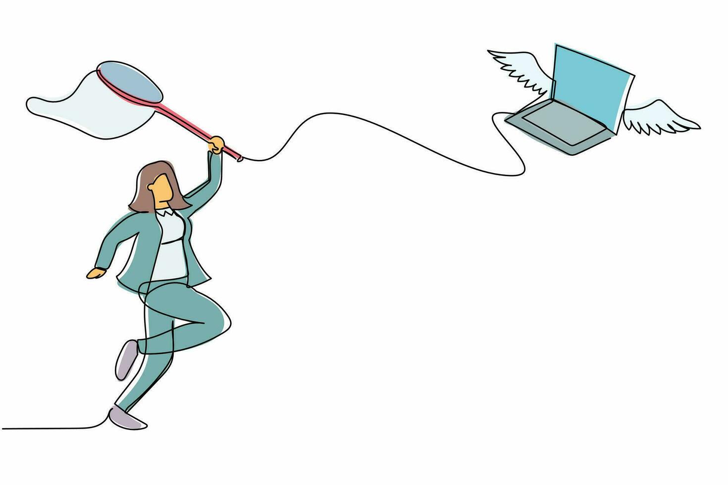 Single one line drawing businesswoman try to catching flying laptop with butterfly net. Losing data information due to cyber crime or computer virus. Continuous line graphic design vector illustration Pro Vector