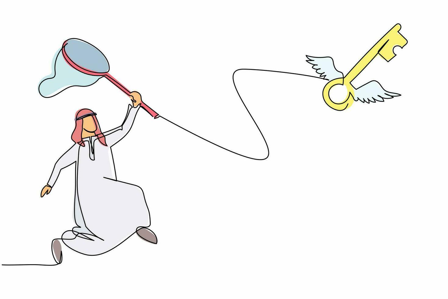 Continuous one line drawing Arabian businessman try to catching flying key with butterfly net. Lost the key to success in career. Business metaphor. Single line draw design vector graphic illustration Pro Vector