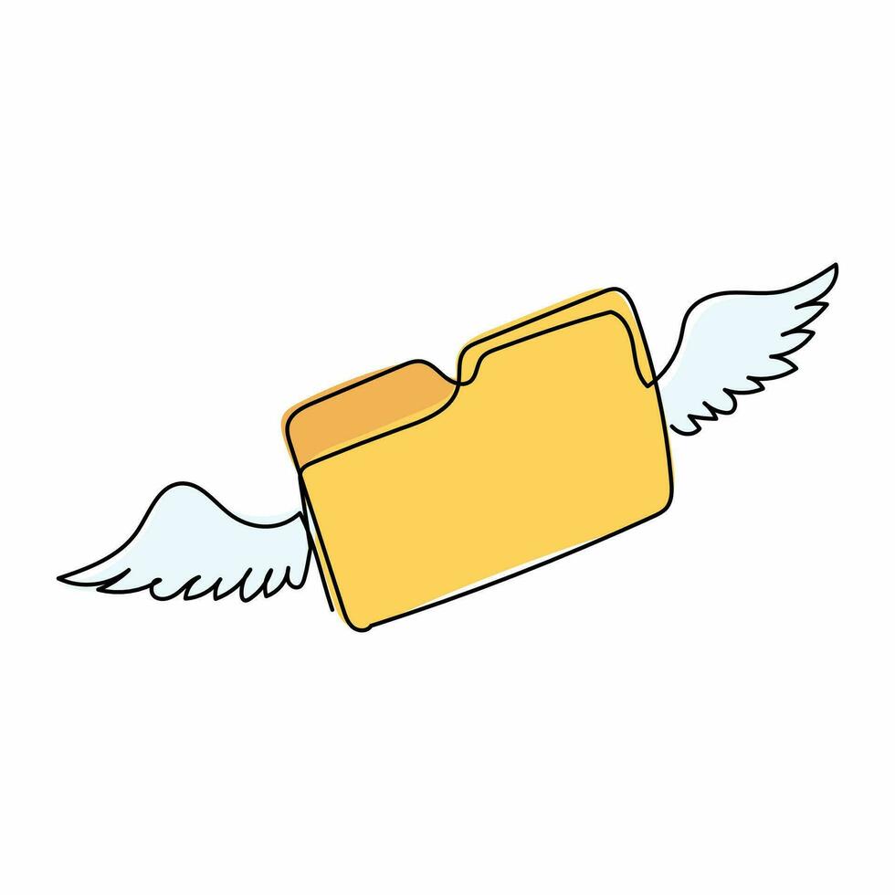 Single continuous line drawing flying document folder with wings. Minimal design folder with files, paper icon symbol. File management concept. Dynamic one line draw graphic design vector illustration Pro Vector