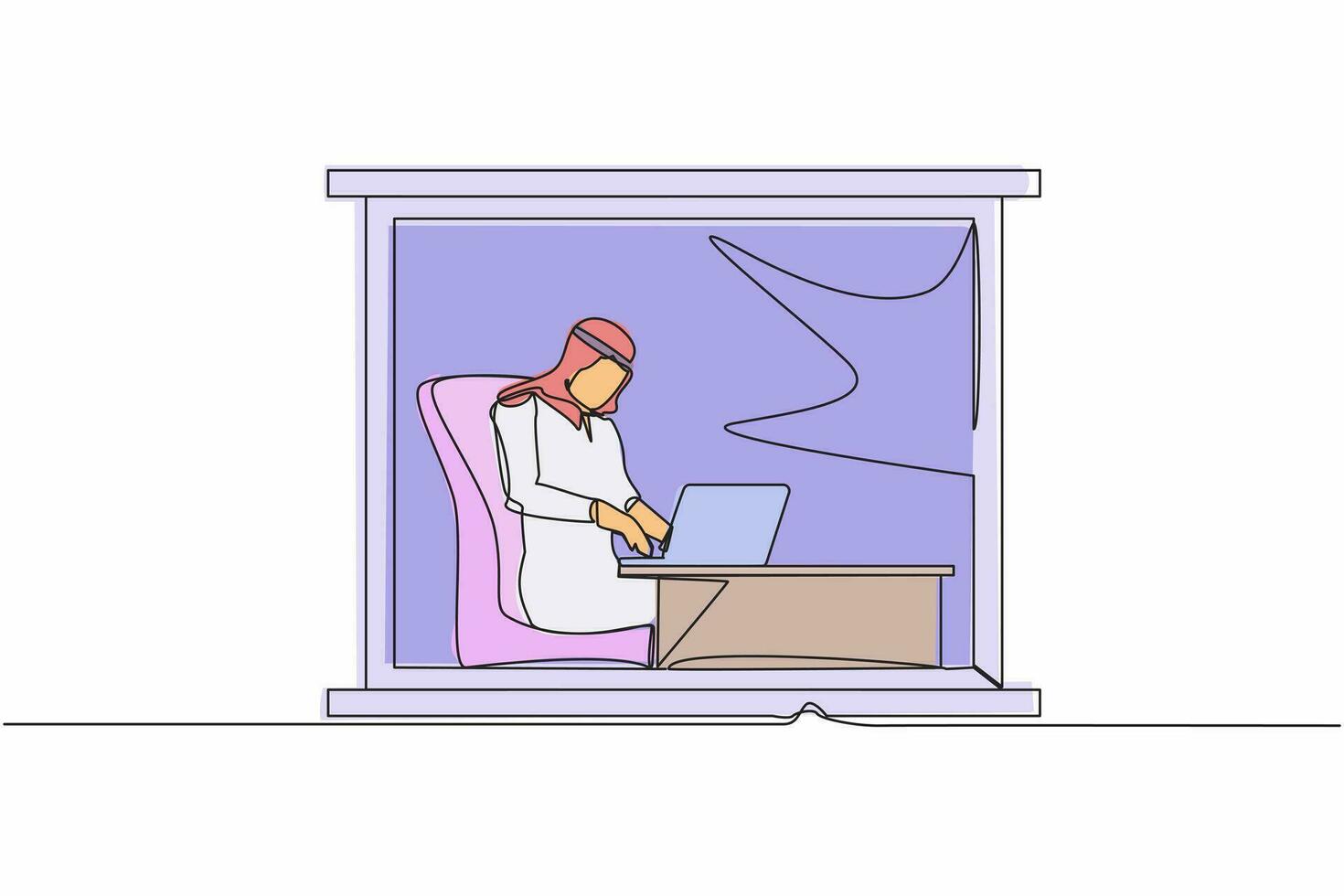 Single continuous line drawing Arab man working from home near window. Businessman sitting at desk and using laptop. Project management. Remote work or home office. One line draw graphic design vector Pro Vector