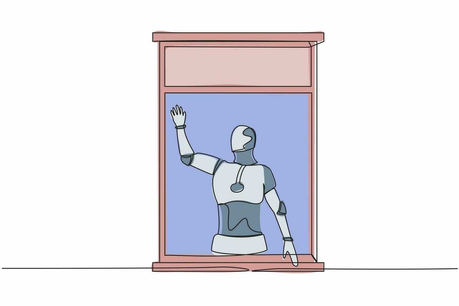 Continuous one line drawing robot waving at window as look like to greet or invite friends to come in. Humanoid robot cybernetic organism. Future robotic. Single line draw design vector illustration Pro Vector