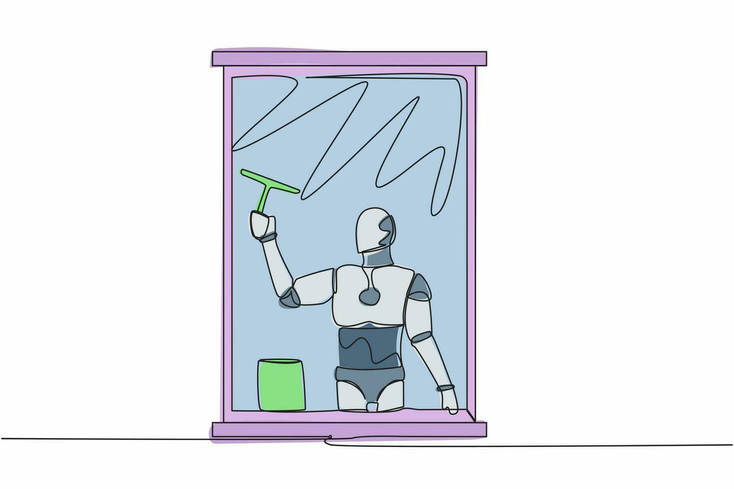 Single one line drawing of robot cleaning windows with glass cleaner tools. Washing windows with bucket, detergent, wet rag. Robotic artificial intelligence. Continuous line design vector illustration Pro Vector