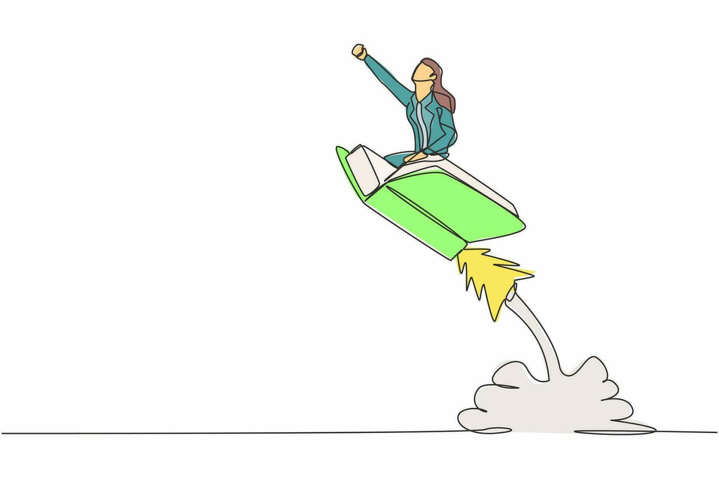 Single continuous line drawing businesswoman riding open book rocket flying in sky. Launch new library at school. Increase interest in reading smart student. One line draw design vector illustration Pro Vector