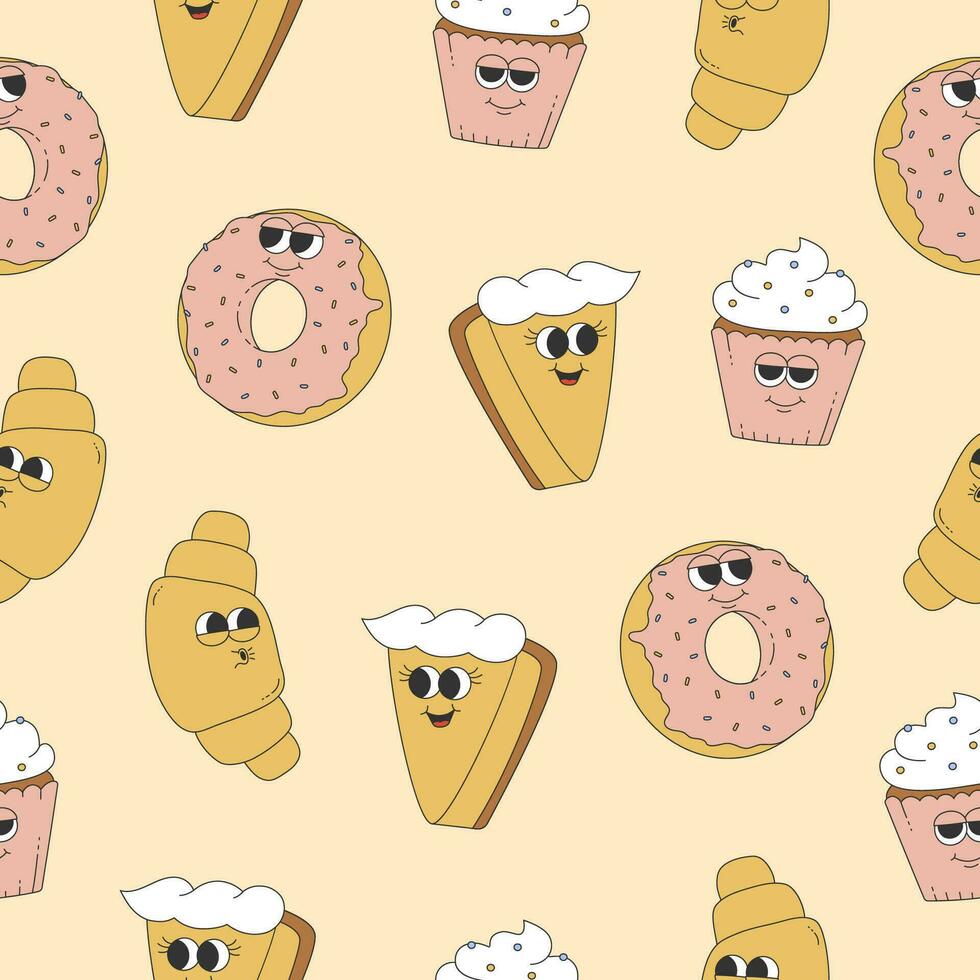 Seamless pattern of groovy cake, croissant, donut and cupcake. Cartoon character in trendy retro style on pink background Pro Vector