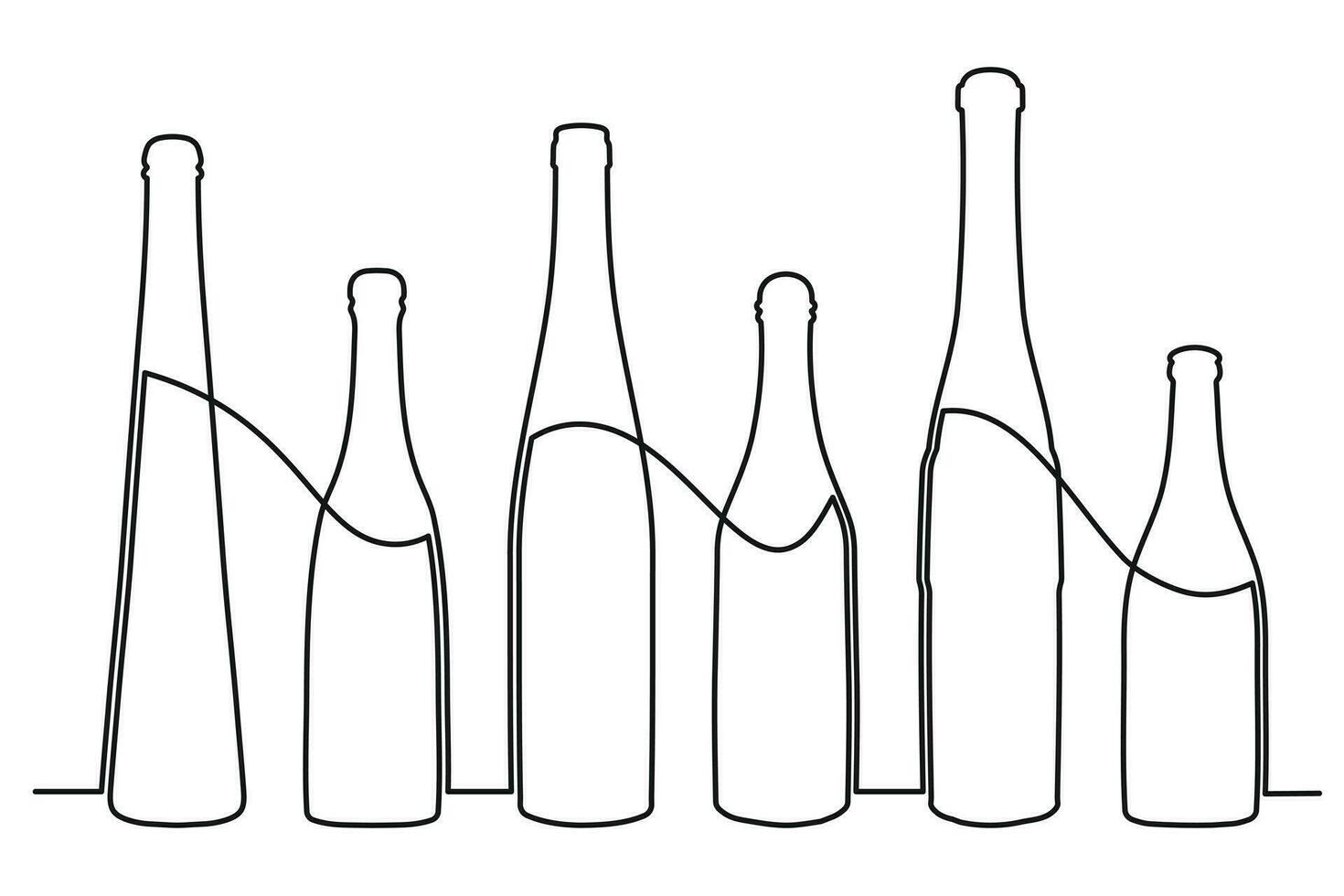 Sketch drawing of a bottle of different shapes in the style of one solid continuous line. Collection of alcoholic drinks Pro Vector