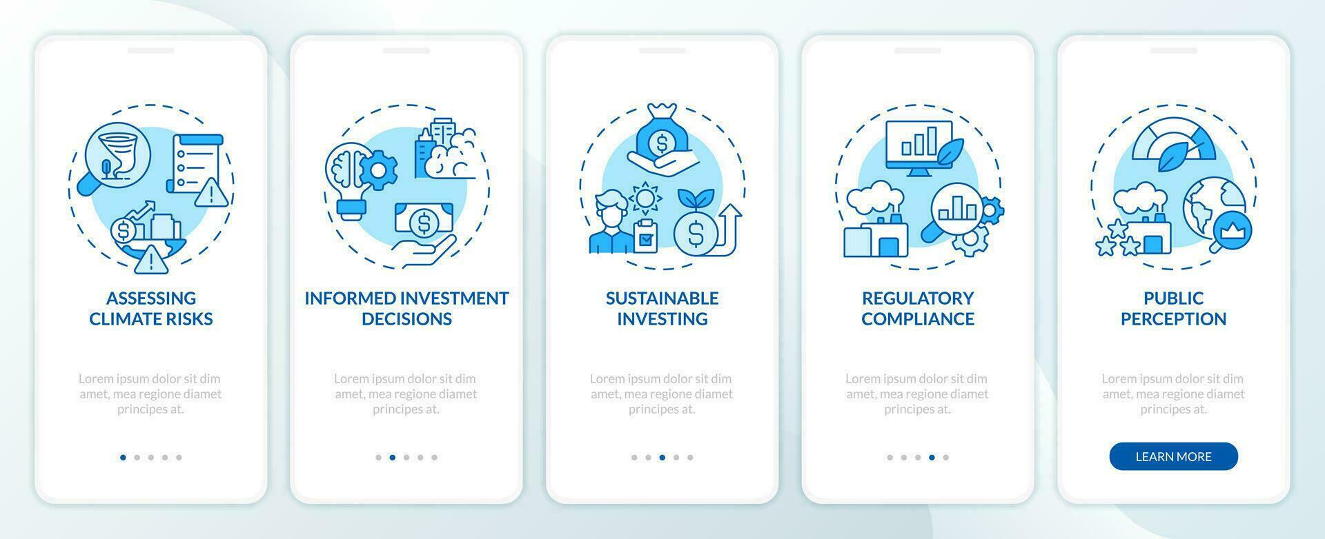 2D icons representing climate metrics mobile app screen set. Walkthrough 5 steps blue graphic instructions with linear icons concept, UI, UX, GUI template. Pro Vector
