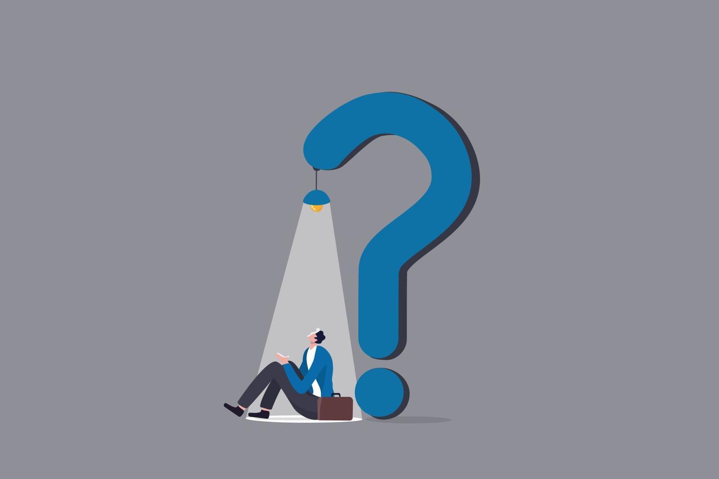 Hope in crisis, solution or opportunity in problem or difficulty, idea discovery to solve trouble concept, depressed businessman just discover light of hope and opportunity from question mark problem. Pro Vector