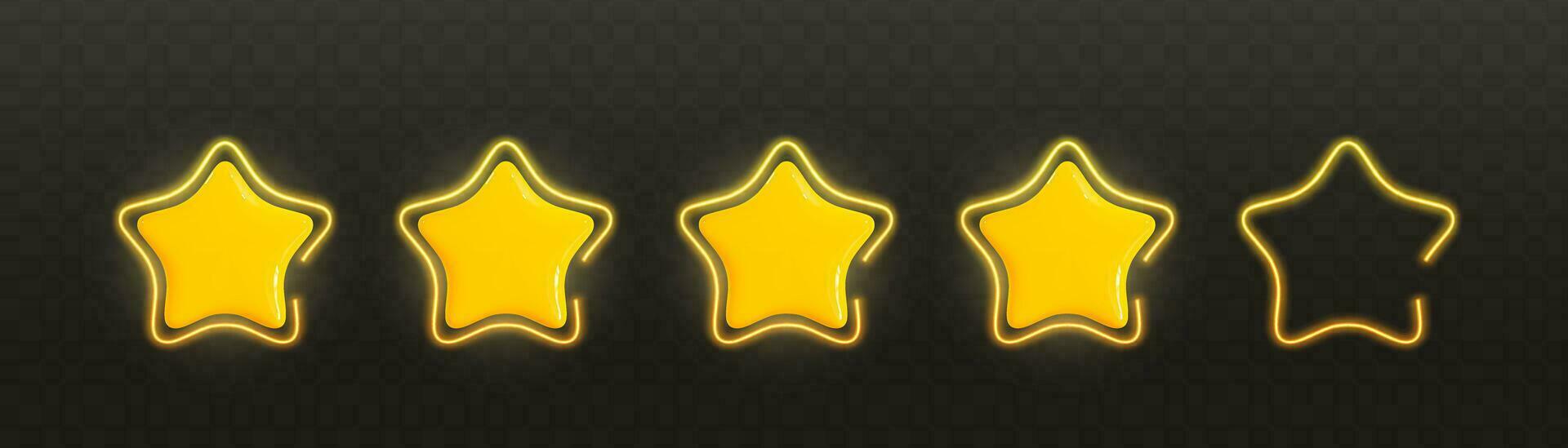 Five glossy golden 3d stars with neon frames in realistic style. Symbol design for game, ui, feedback, website. Rating concept. Yellow plastic stars on dark background. Vector illustration Pro Vector