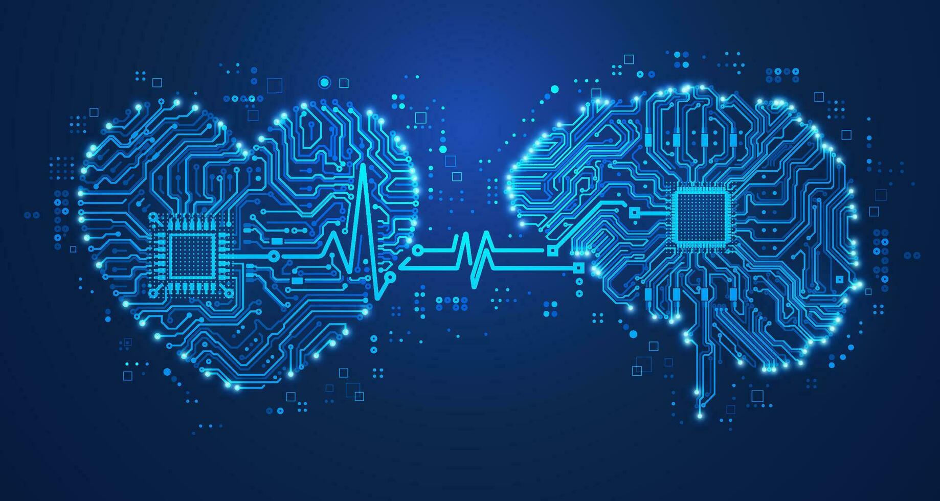 concept of connection between mind and interllect or deep learning, graphic of cyber heart and brain with futuristic element Pro Vector
