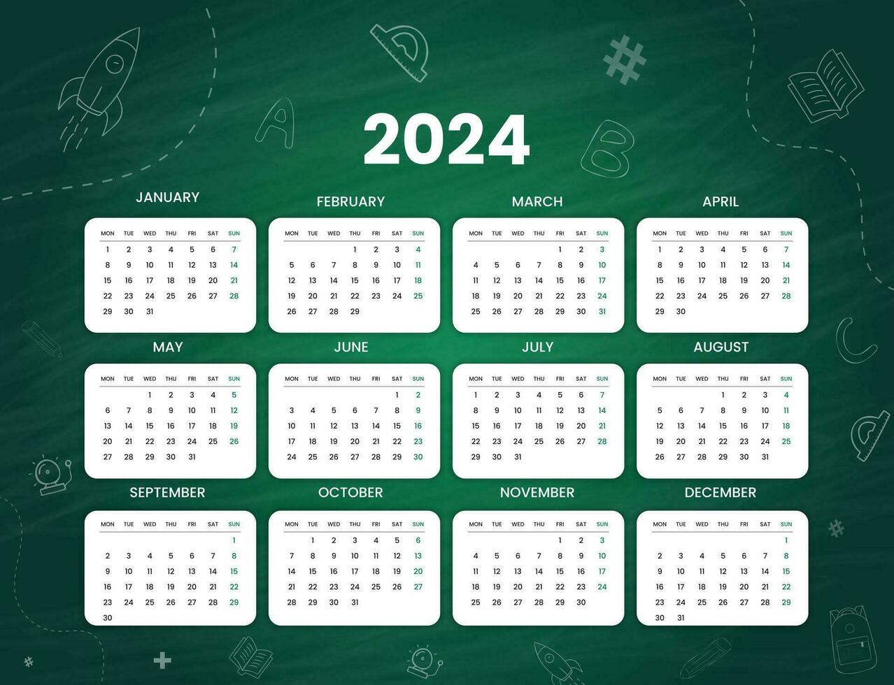 Green minimal 2024 desk calendar template, cool hand drawn school object background design Pro Vector