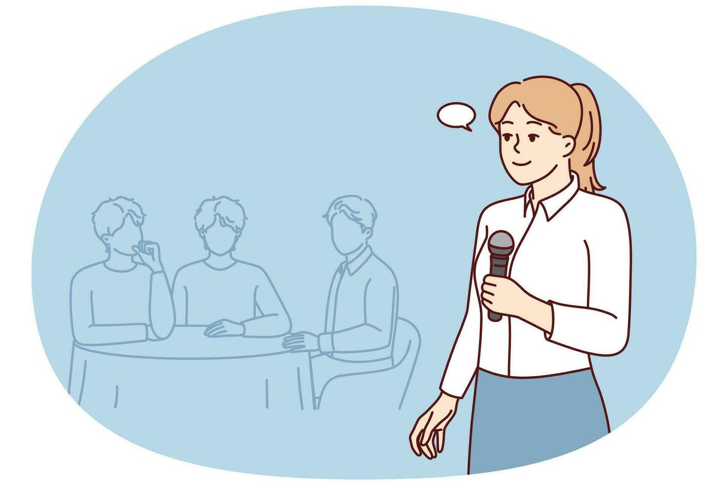 Woman with microphone host on quiz where teams compete by answering questions. Vector image Pro Vector