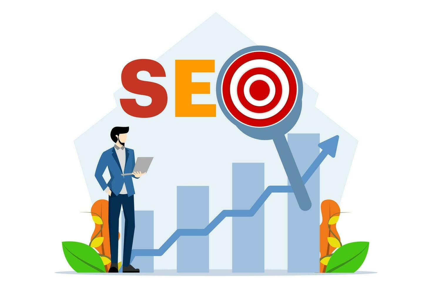 Search Engine Optimization ranking concept, SEO, arrow pointing to a magnifying glass with SEO abbreviation letters, idea for promoting traffic to a website. businessman with laptop looking at graph. Pro Vector