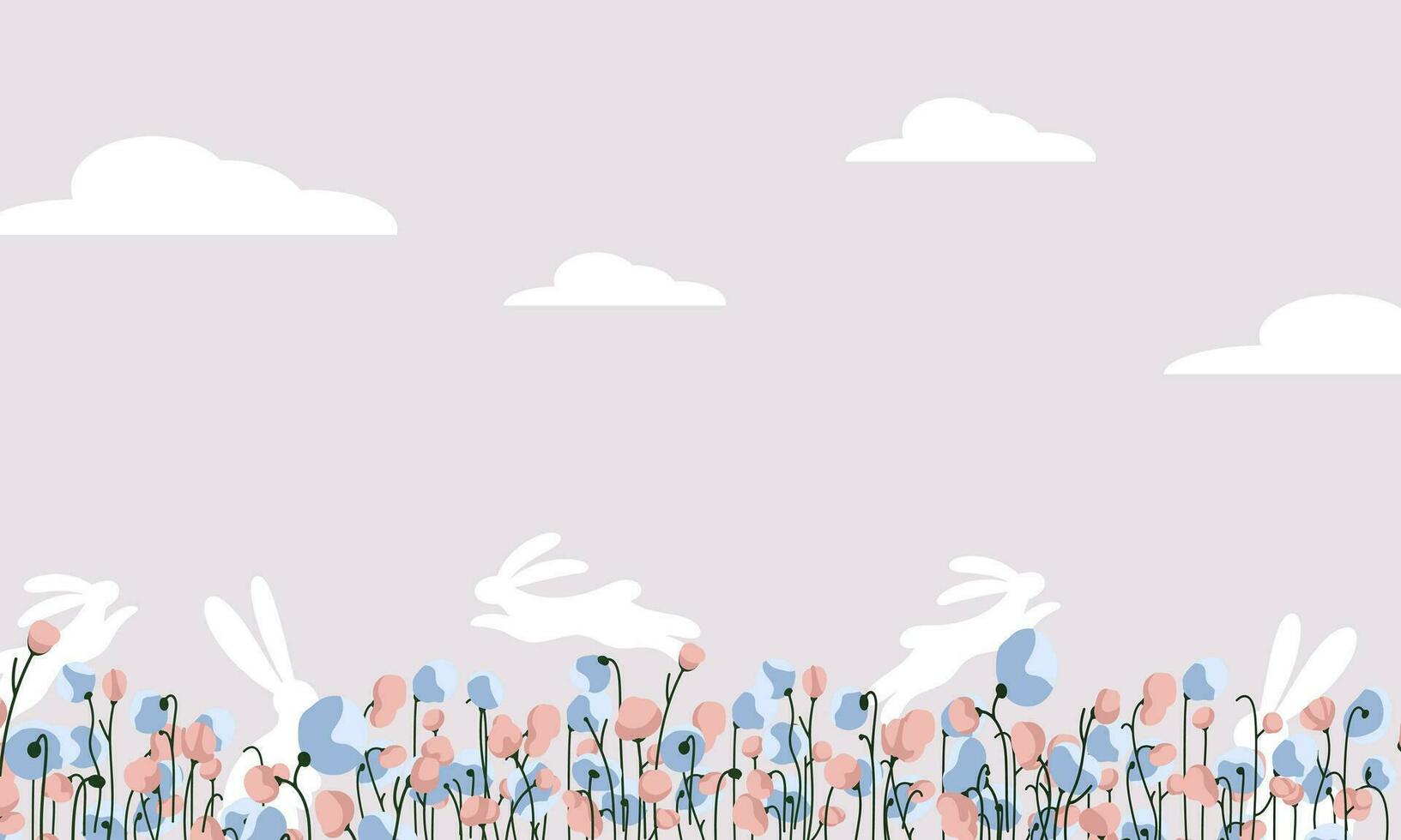 Easter background with spring flowers, silhouettes of rabbits and clouds. Spring and Easter background with a place for text Pro Vector