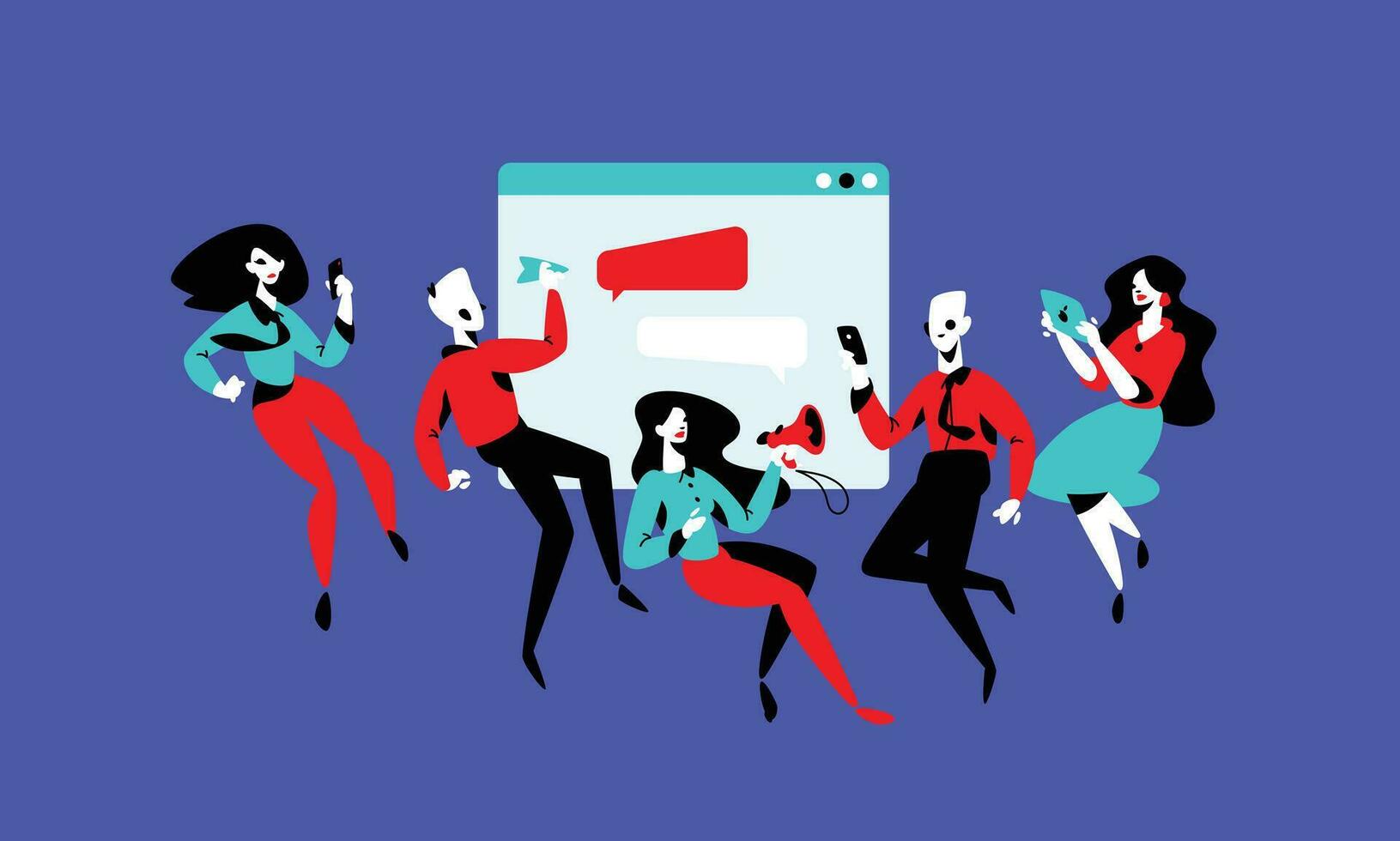 Illustration of managers on the background of the interface. Employees in the office. Image is isolated on a blue background. Developing applications. Banner for website and print. Pro Vector