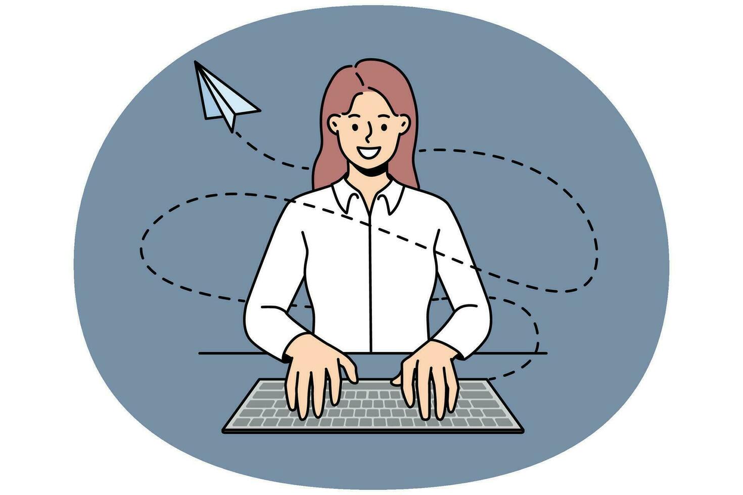 Smiling businesswoman typing on keyboard sending message Pro Vector