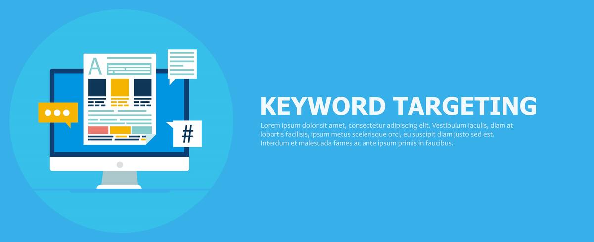 Keyword Targeting Banner. Computer with text and icons. Vector flat illustration Pro Vector