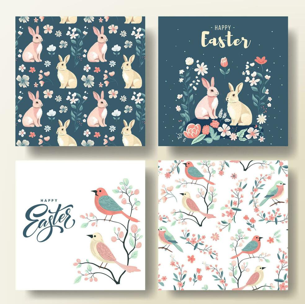 Set of Spring greeting cards and seamless pattern with birds and bunnies, spring template. Happy Easter frame Pro Vector
