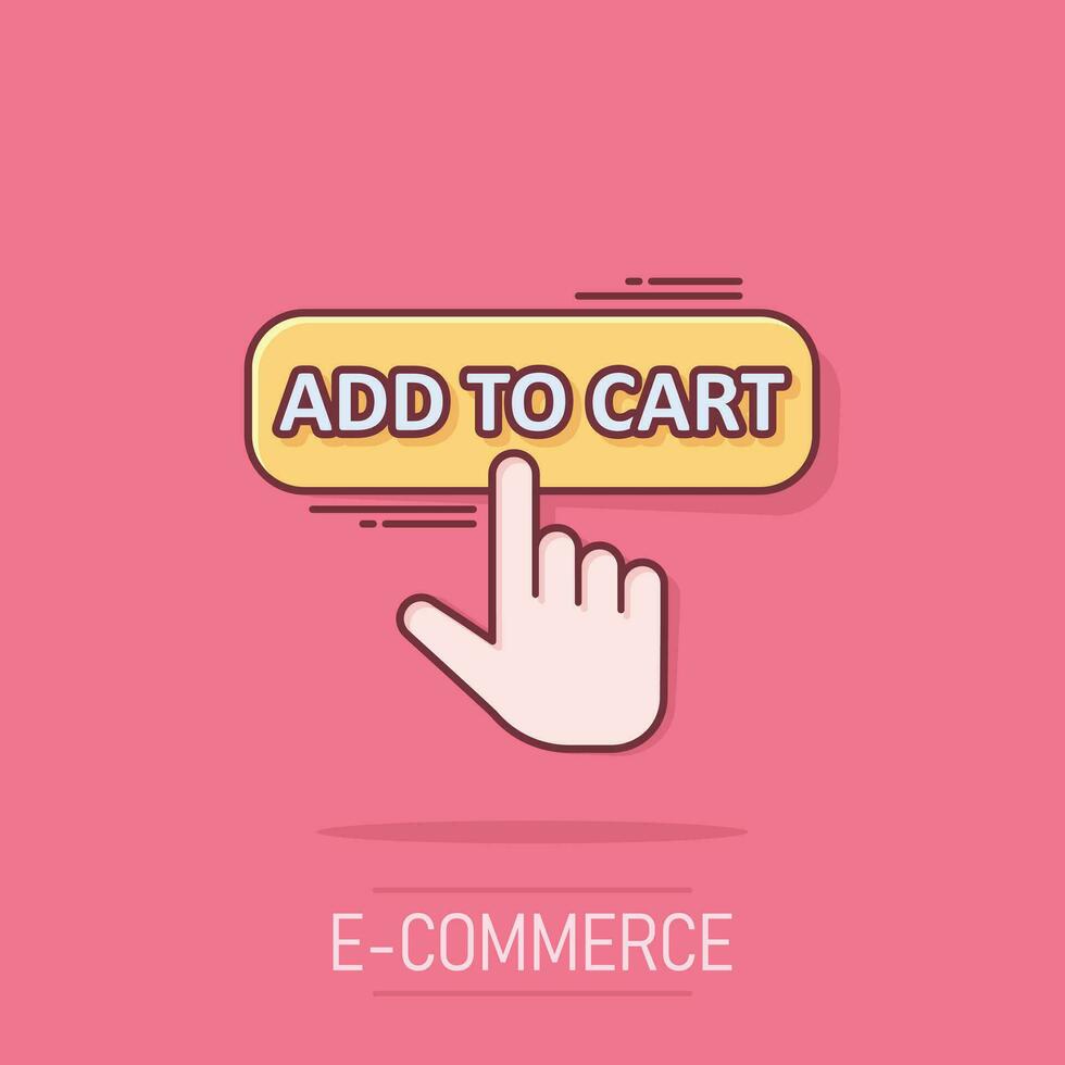 Add to cart shop icon in comic style. Finger cursor vector cartoon illustration on white isolated background. Click button business concept splash effect. Pro Vector