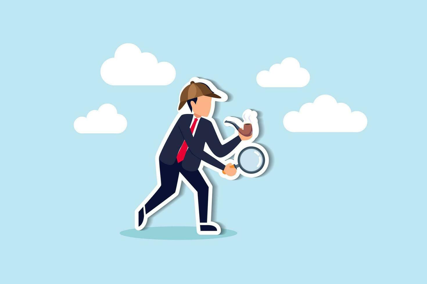 Observation or inspection to find out and discovery useful information, detective or investigate and analyze data concept, smart detective looking through magnifying glass to search for evidence. Pro Vector