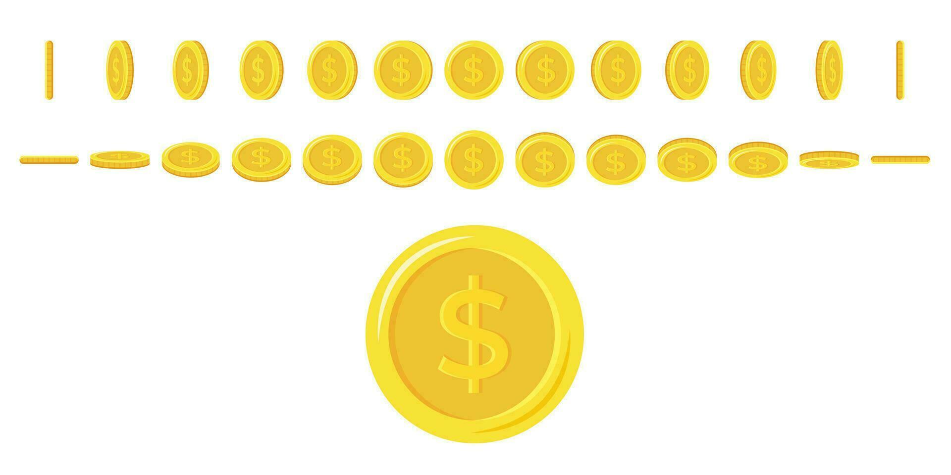 Dollar coins rotating. Set of rotation gold coins at different angles for animation. Flat vector illustration. Pro Vector